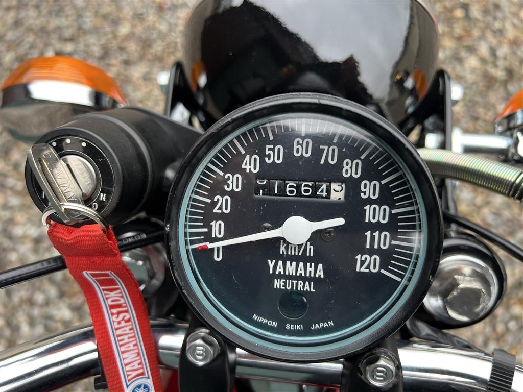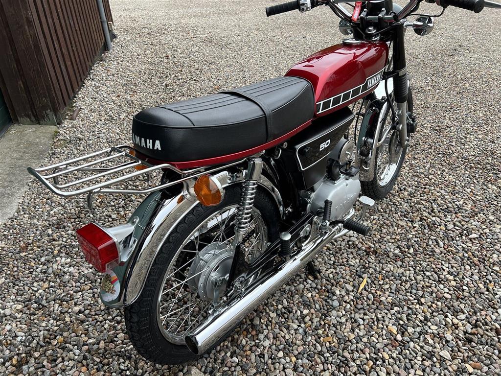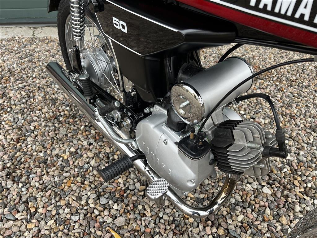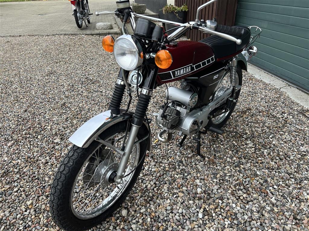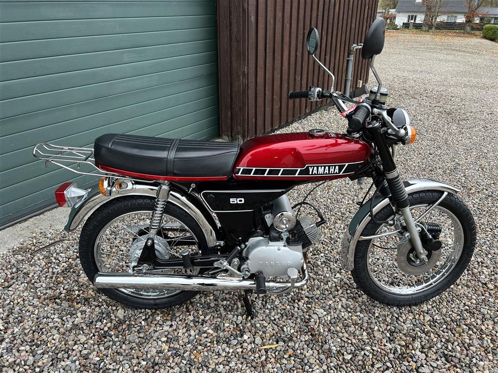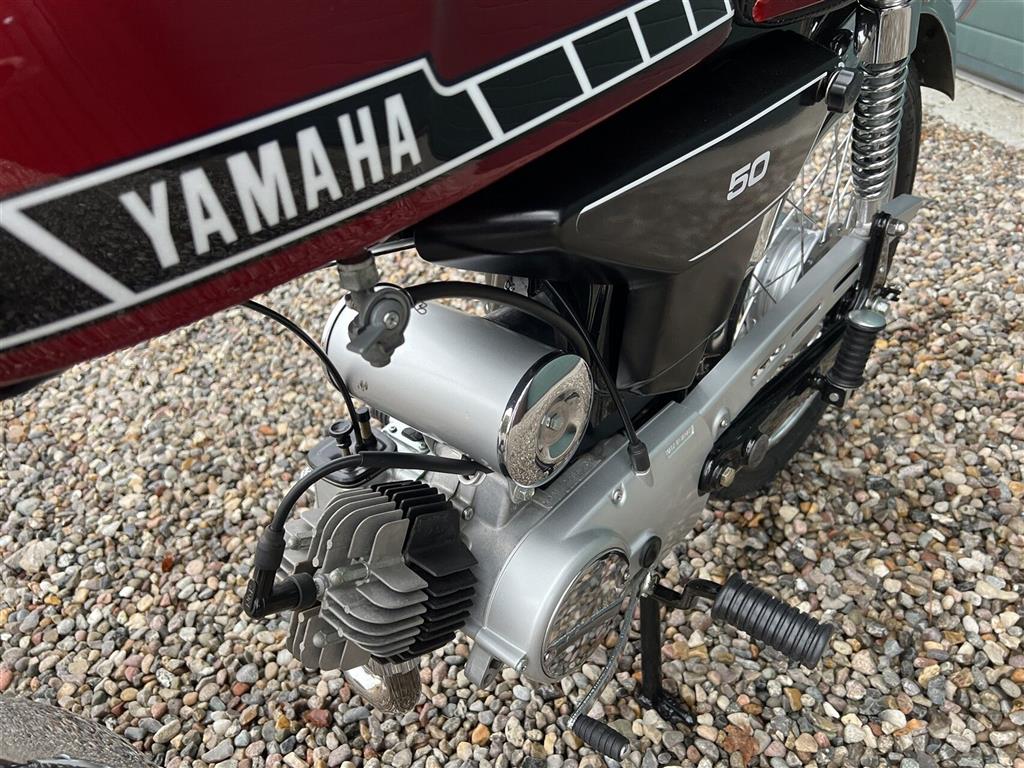 Yamaha FS1 50 DX knallert, 4-gear og skivebremser, årg. 1978 rødmet.