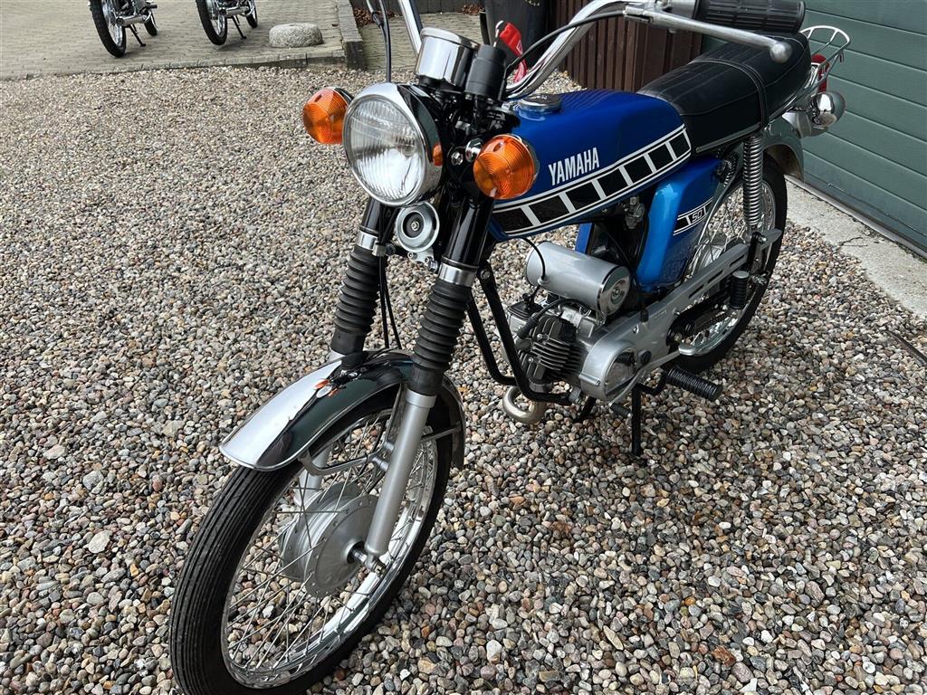 Yamaha FS1 50 knallert 4-gear, årg. 1976 blåmet. Dansk knallert fra ny med 381 stelnummer. Flot restaureret, fremtræder i meget fin stand.